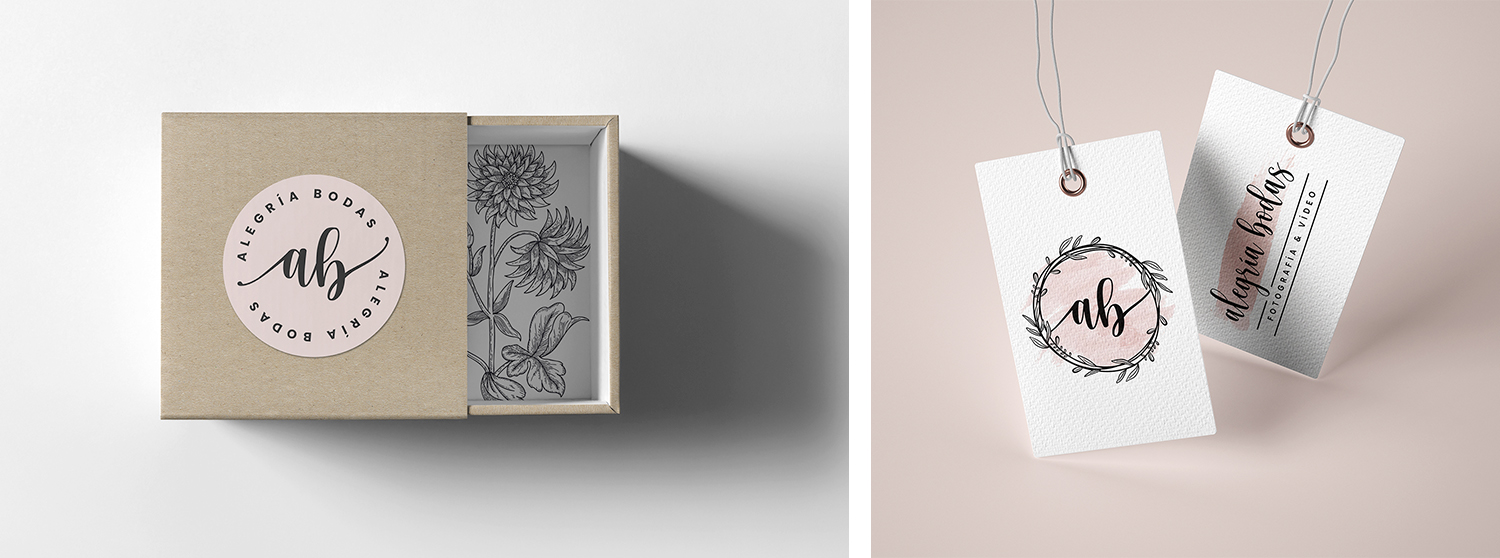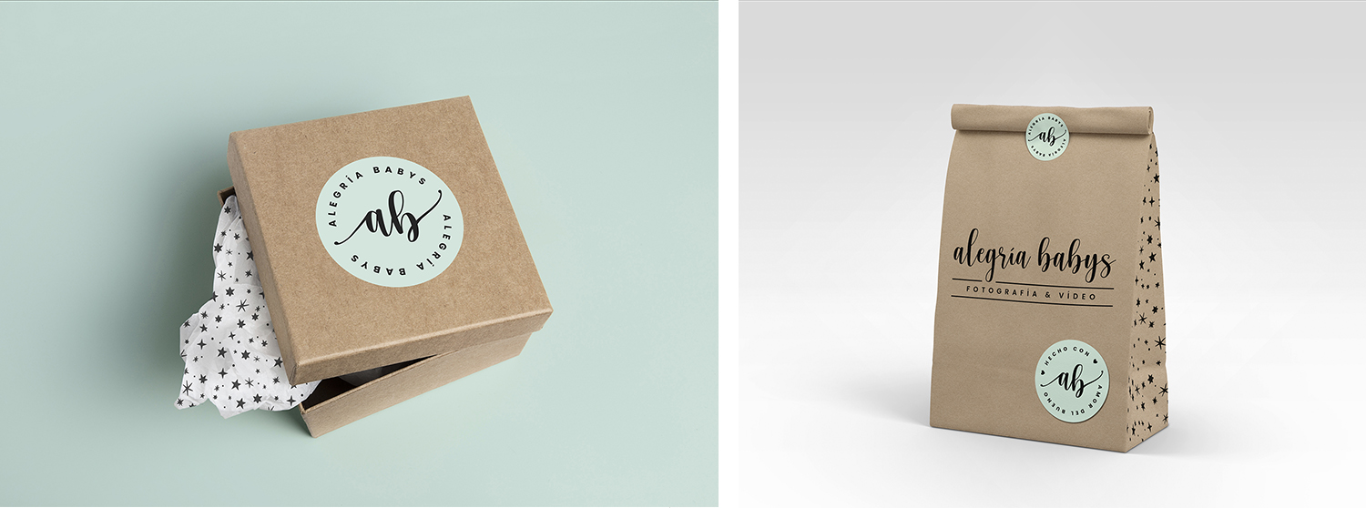 La imagen para Alegría Bodas parte de la marca principal, acompañada en este caso de ornamentos florales en busca de sumar femineidad. La paleta de color empleada presenta tonos neutros y pastel con tendencia al rosa o nude. En el caso de Alegría Babys el uso de las estrellas traslada a un mundo onírico e infantil, con una paleta de color con tendencia al menta.